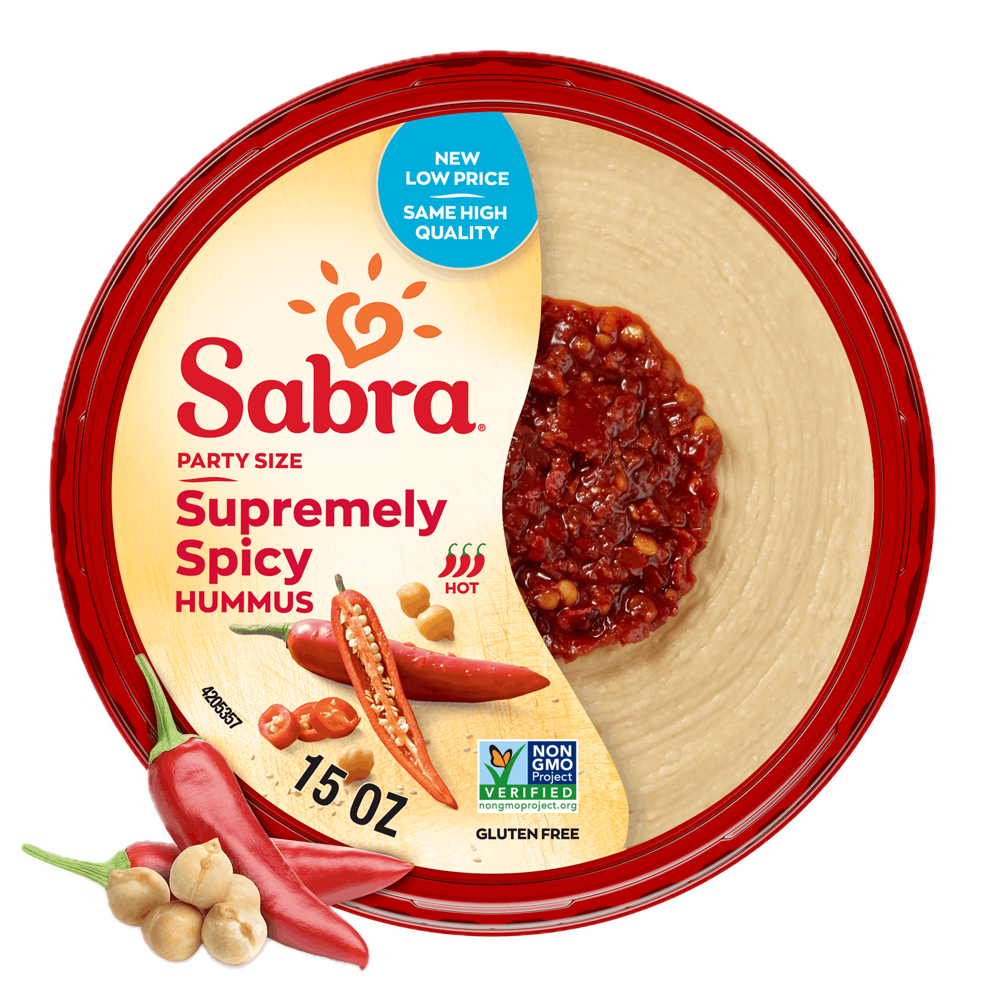 - Supremely Spicy Hummus Dip: Like to test your taste buds? Sabra® Supremely Spicy Hummus is for you. We start with our classic hummus, then we add a blend of chili peppers, red peppers, and spices, creating a mouthwatering snack that bites back. 15 oz.